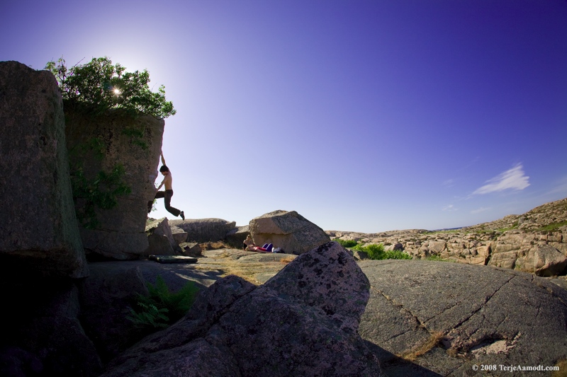 After spending a day in Oslo visiting some friends of us that we hadn’t seen for years, we drove to Bohuslen in Sweden. Bohuslen has some really good crack climbing. I would say world class, but that’s my opinion. Funny thing is that Tor and Marte, friends of us from Molde, also were there. And we hadn’t plan it at all 🙂 They had found a perfect place for camping by a lake. That was so good because it was so hot during the day.. I think it must have been more than 30 degrease in the shade. Because of that we ended up swimming more than climbing.